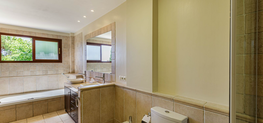The property hosts a total of five well-proportioned bedrooms, all appointed with fitted wardrobes and enjoying either en-suite or adjacent bathrooms. The magnificent principal suite is a private retreat, boasting its own terrace with beautiful sea and golf views, and a large, luxurious en-suite bathroom. The additional guest bedrooms are equally impressive, offering attractive outlooks over the garden, pool, and the rolling green hills of Los Arqueros. Throughout the home, cream marble flooring, double glazing, and high-quality finishes create a calm, sophisticated, and cohesive atmosphere.